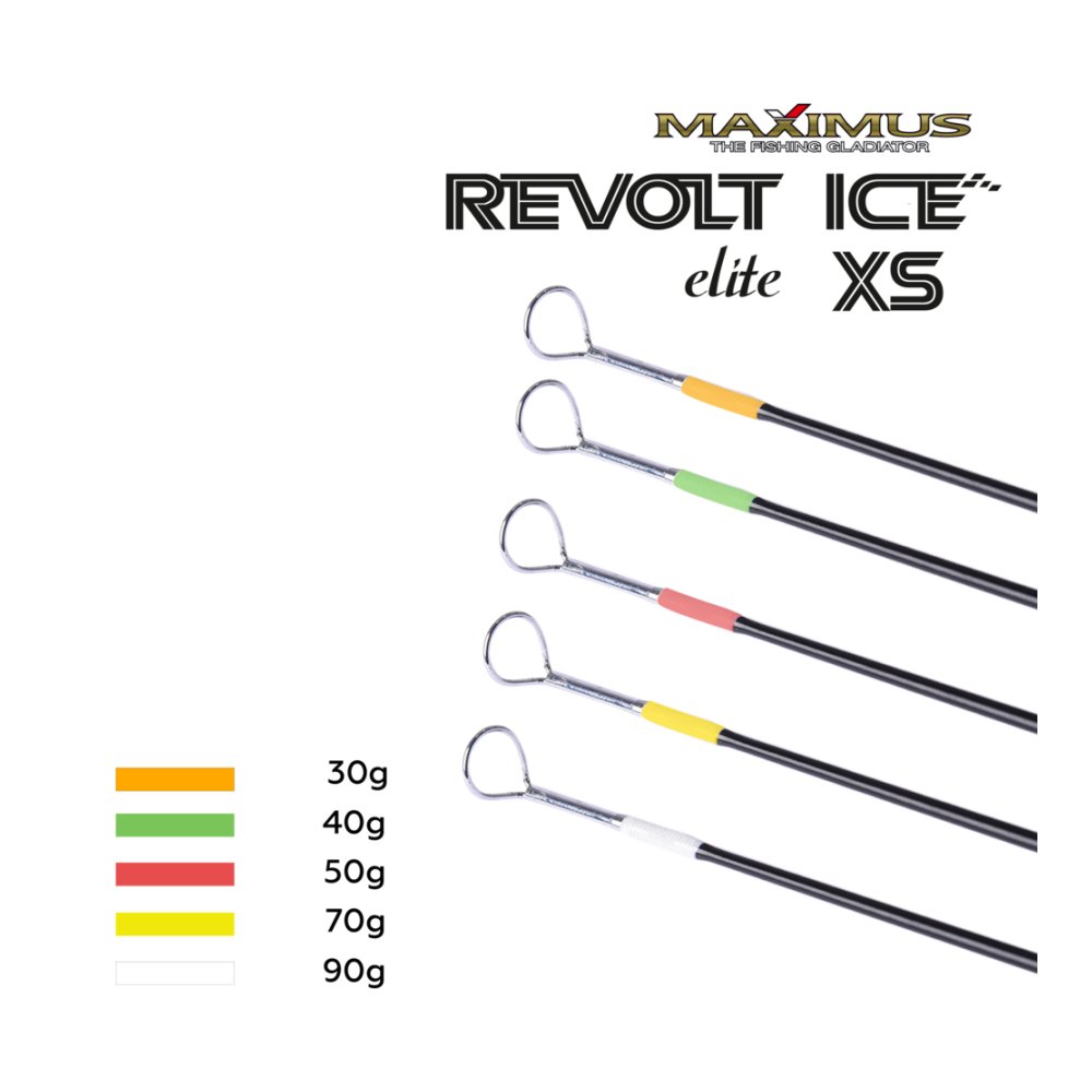 Maximus Revolt Ice Elite XS – tai riboto leidimo profesionalios žieminės meškerės, skirtos sterkų, ešerių, upėtakių ir lydekų žūklei. Atnaujintas modelis, pasikeitė dizainas, tačiau pati forma išliko ta pati. Ritės laikiklis pritaikytas modernių žieminių ričių naudojimui. Žiedeliai skirti lengvai pašalinti sniegą ir ledą. Rankena pagaminta iš sublimuotos medienos ir turi unikalų dizainą, sukurta patogiausiam sukibimui. Modeliai skiriasi viršūnių spalva. Veiksna Extra-Fast Action, blankas IMF graphite. Chromuotos vielos žiedeliai, lengvi, viena kojele. Testas iki 30 g.
